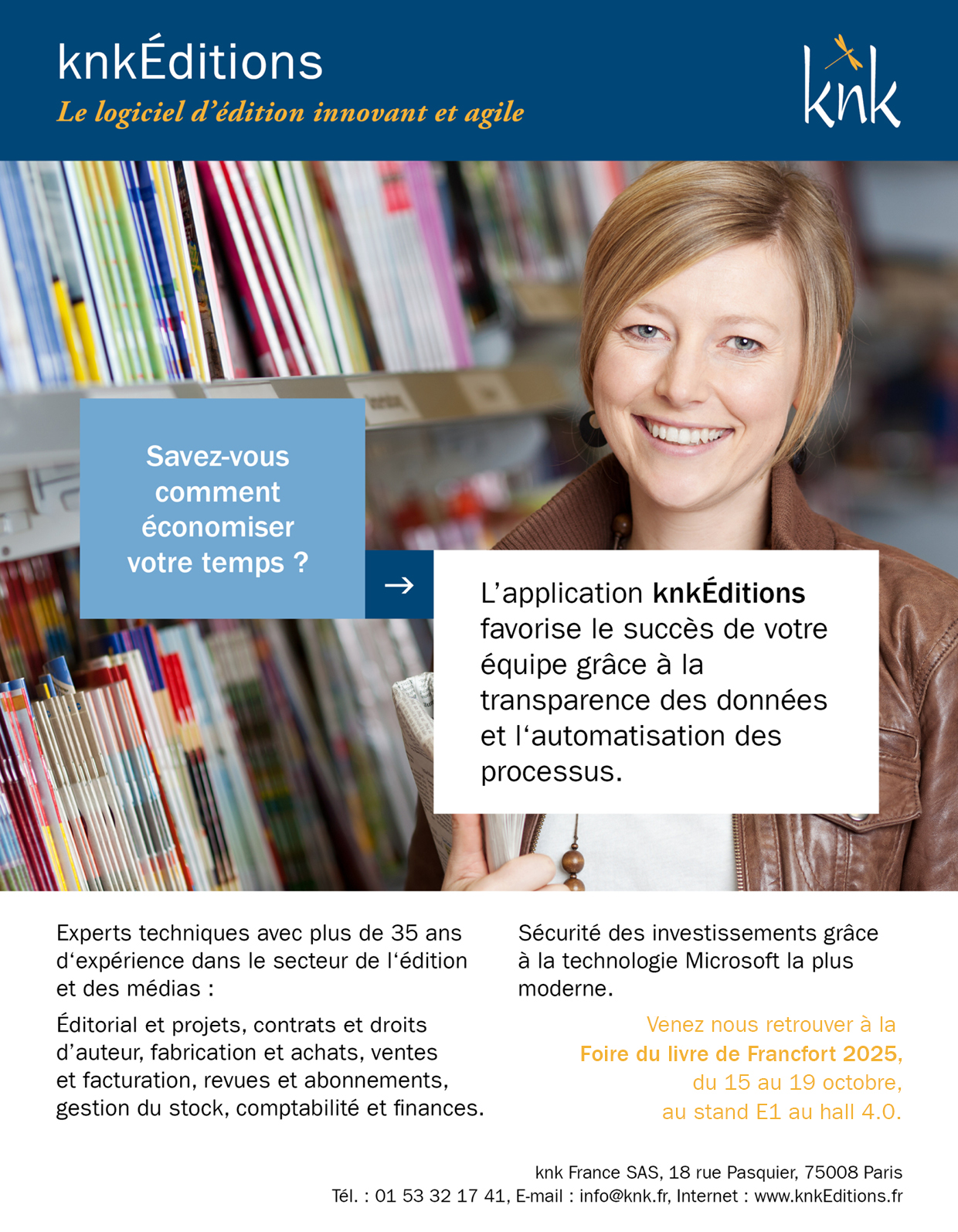 Après une analyse approfondie, le groupe d'édition AC MEDIA (« Ki-oon », « Mana Books » et « Lumen »), un des éditeurs français avec une croissance des plus dynamiques, a décidé d'optimiser ses processus à l'aide du logiciel d'édition knkÉditions. [...]